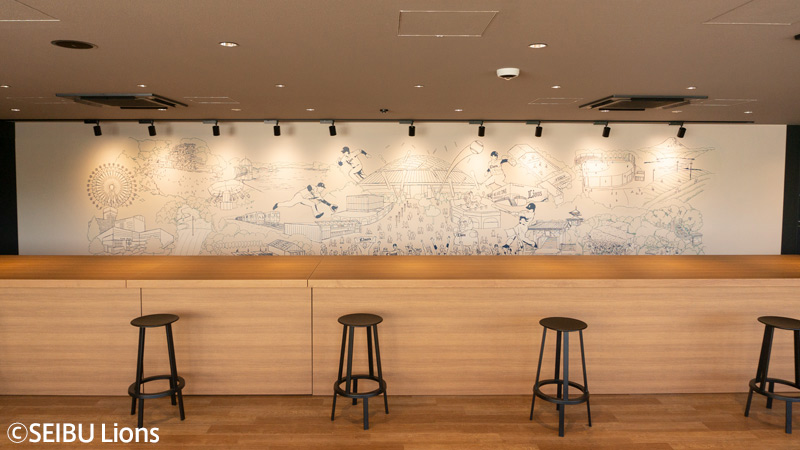 西武園ゆうえんちや狭山湖、所沢駅などドーム周辺を象徴する施設や名所とライオンズの選手・ファンが一体となった横幅12m、高さ2.5mの巨大なイラストです。